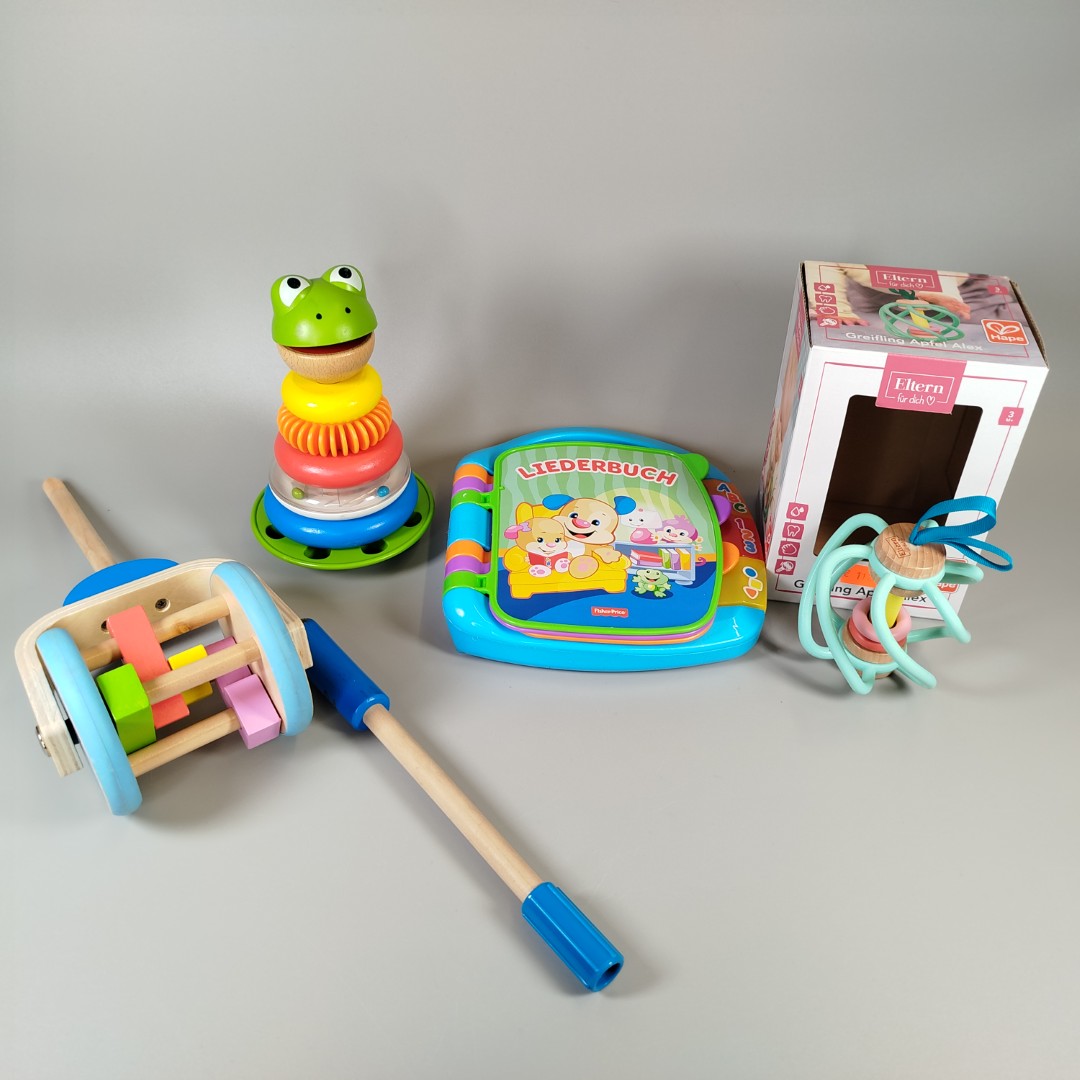 Babyspielzeug-Konvolut – Stapelturm, Buch, Rassel